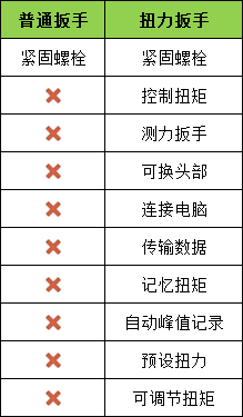綜上扭力扳手能滿足各個領域對于扭矩的要求,達到有效的完成緊固螺紋件的目的。以下簡單列出關于普通扳手和扭力扳手的區別: